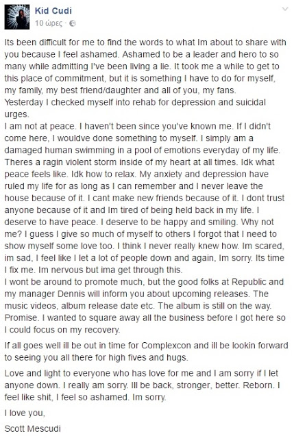 «Μου είναι πολύ δύσκολο να βρω τις λέξεις που θα μοιραστώ μαζί σας και νιώθω ντροπή. Ντρέπομαι γιατί κάποιοι με θεωρούν πρότυπο και με θαυμάζουν, ενώ εγώ ζω σε ένα ψέμα.Δεν νιώθω γαλήνη. Δεν ένιωσα ποτέ, από τότε που με γνωρίζετε. Αν δεν καταφέρω να ηρεμήσω, θα κάνω κάτι στον εαυτό μου… Στην καρδιά μου υπάρχει συνεχώς μια καταιγίδα. Το άγχος και η κατάθλιψη ορίζουν τη ζωή μου από τότε που θυμάμαι τον εαυτό μου και εξ’ αιτίας τους δεν μπορώ να φύγω από το σπίτι, δεν μπορώ να κάνω φίλους, δεν μπορώ να εμπιστευτώ κανέναν. Κουράστηκα να μένω πίσω στη ζωή μου. Αξίζω να έχω γαλήνη, να είμαι χαρούμενος και να χαμογελάω.ίμαι φοβισμένος και στεναχωρημένος και νιώθω ότι απογοήτευσα πολλούς ανθρώπους. Σας ζητώ συγγνώμη. Ήρθε η στιγμή να με επιδιορθώσω!»