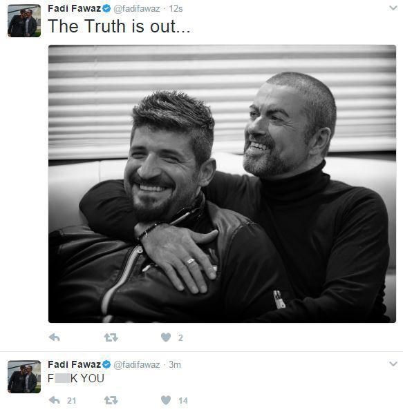 Έτσι ο Φαουάζ έγραψε στον λογαριασμό του στο Twitter: «Αντα γαμ...τε. Η αλήθεια φάνηκε», ενώ ταυτόχρονα ανήρτησε και μία φωτογραφία του με τον Τζορτζ Μάικλ αγκαλιά.