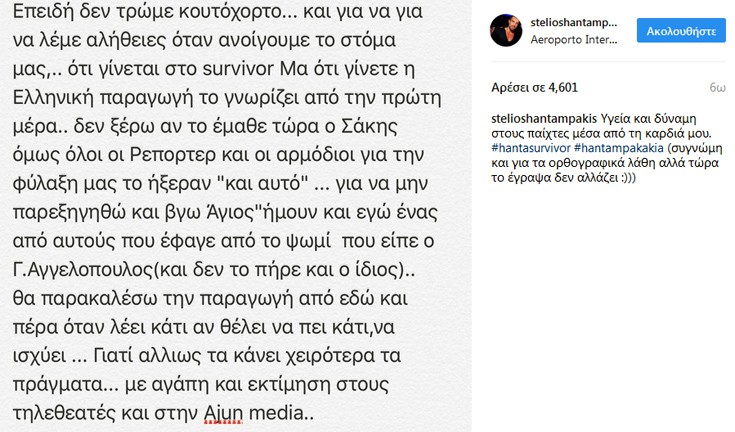 Στα όσα έγραψε στο Instagram ο πρώην παίκτης των Διασήμων τόνισε ότι ό,τι γίνεται στο παιχνίδι η παραγωγή το ξέρει από την πρώτη στιγμή. «Ήμουν και εγώ ένας από αυτούς που έφαγε το ψωμί που είπε ο Γ. Αγγελόπουλος (και δεν το πήρε και ο ίδιος)» γράφει χαρακτηριστικά.