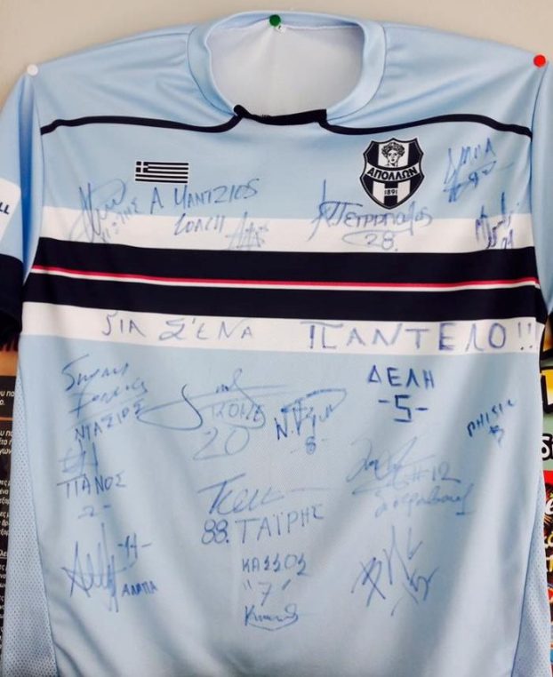Παράλληλα, οι ποδοσφαιριστές έκαναν δώρο στην οικογένεια Παντελίδη μία φανέλα του Απόλλωνα με τις υπογραφές τους και με την αφιέρωση «για σένα Παντέλο».