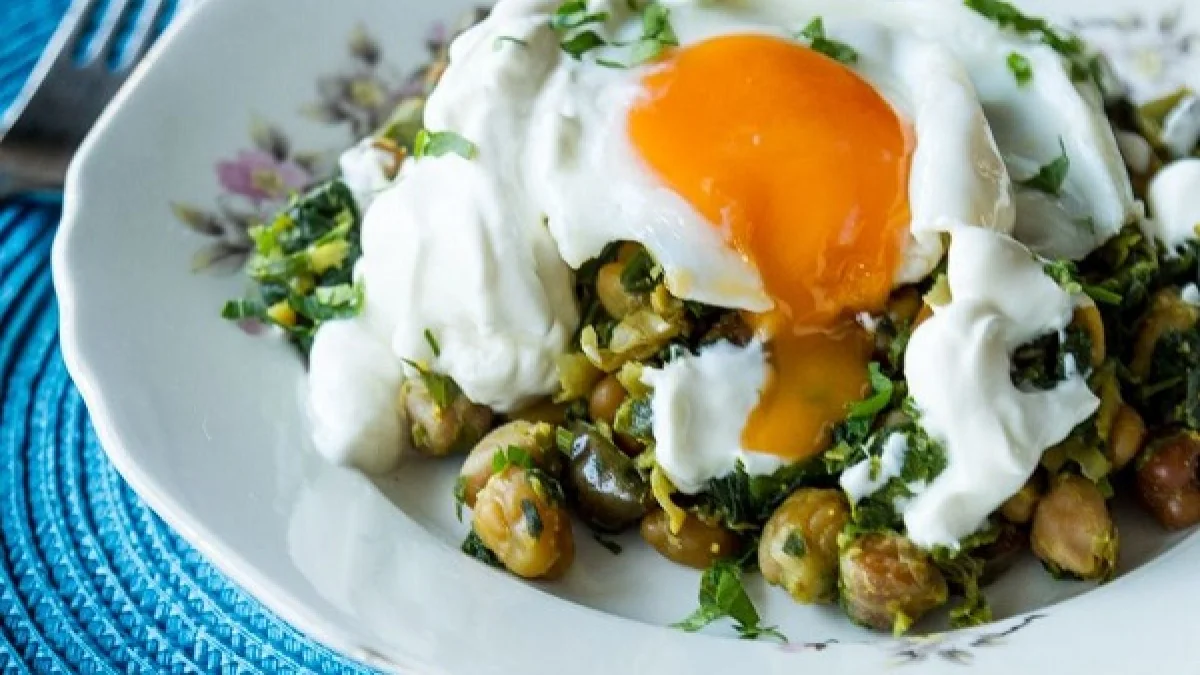 Ψιλοκόβουμε το μαϊντανό και βάζουμε τα ¾ από αυτόν μέσα στο μείγμα με τα ρεβύθια. Χωρίζουμε το μείγμα σε 4 πιάτα και από πάνω βάζουμε από ένα τηγανιτό αυγό.