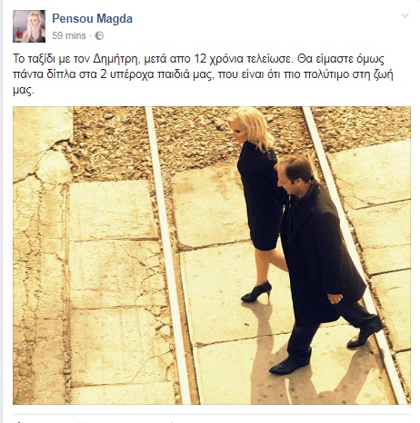 "Το ταξίδι με τον Δημήτρη, μετά απο 12 χρόνια τελείωσε. Θα είμαστε όμως πάντα δίπλα στα 2 υπέροχα παιδιά μας, που είναι ότι πιο πολύτιμο στη ζωή μας", έγραψε σήμερα η ηθοποιός στον λογαριασμό της στο fb και ανέβασε μια κοινή τους φωτογραφία.