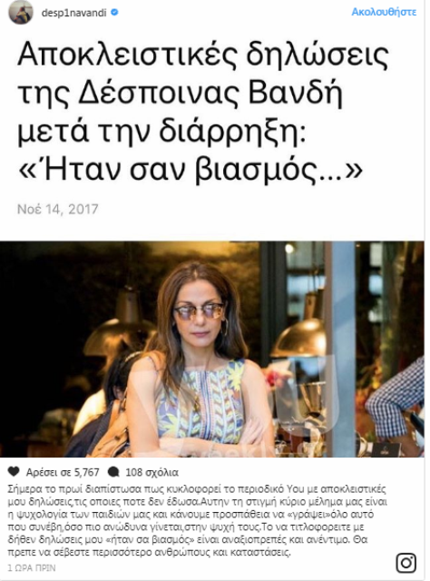 Η Δέσποινα Βανδή δεν μίλησε δημόσια για το θέμα. Παρόλα αυτά, όμως, η τραγουδίστρια διαπίστωσε ότι δημοσιεύονται υποτιθέμενες δηλώσεις της σε εβδομαδιαίο περιοδικό! Μέσα από τον λογαριασμό της στο Instagram, η Δέσποινα ξεσπά: