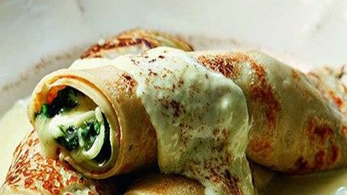 Σε κάθε κρέπα βάζετε από 1 μεγάλη κουταλιά γέμισης και την τυλίγετε σε ρολό, τοποθετώντας το κατόπιν σε ταψί.