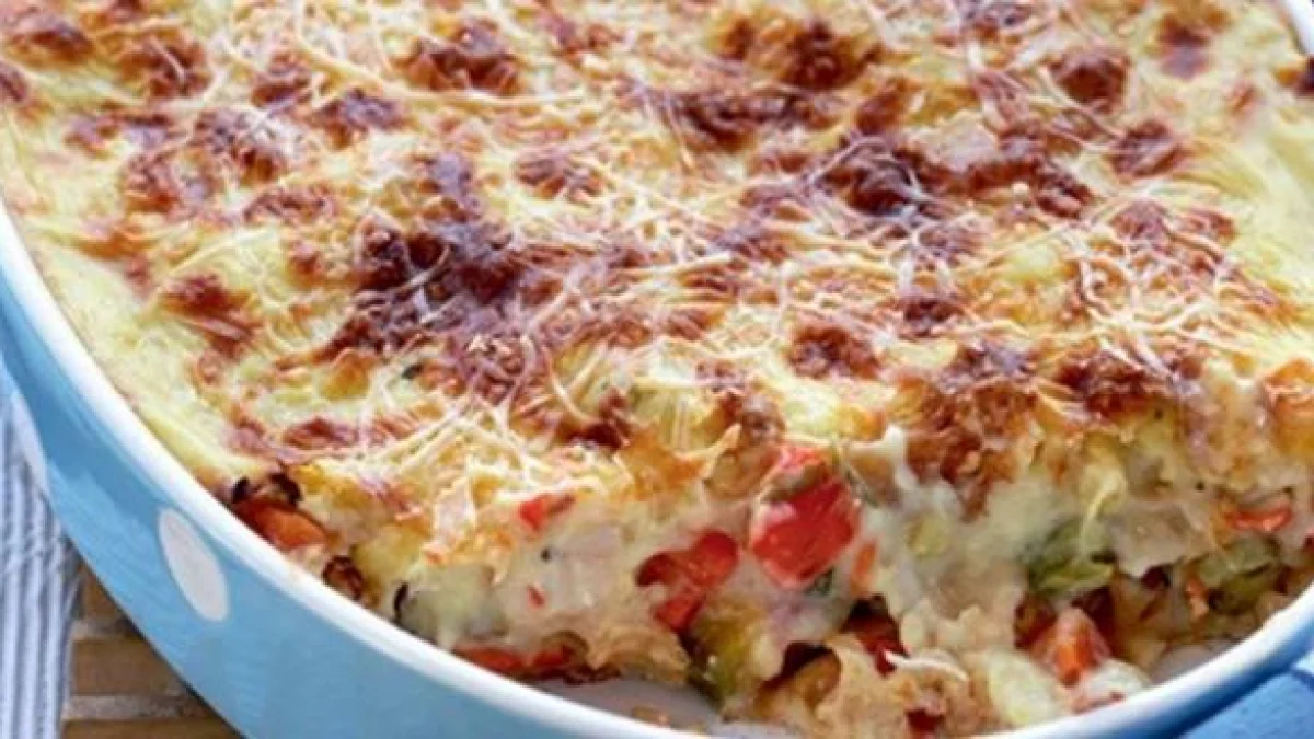 Λαδώνετε ένα βαθύ ταψί, ρίχνετε μέσα το ζυμαρικό σας, τα χτυπημένα αβγά, το τριμμένο τυρί, το γιαούρτι ανακατεμένο καλά και φρεσκοτριμμένο πιπέρι και τα ανακατεύετε καλά με 2 μεγάλα κουτάλια.