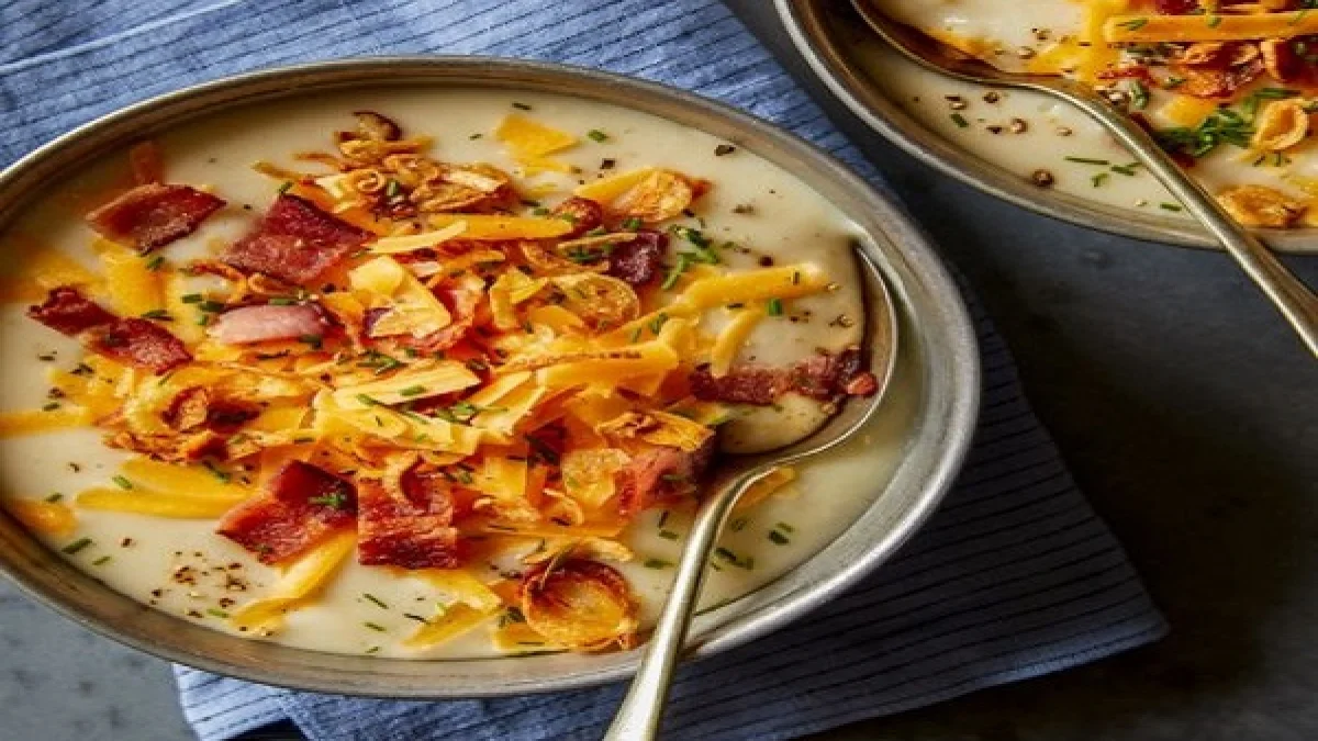 Μοίρασε την σούπα σε μπολάκια και σέρβιρε με σχοινόπρασο, τραγανό μπέικον και τριμμένο cheddar.