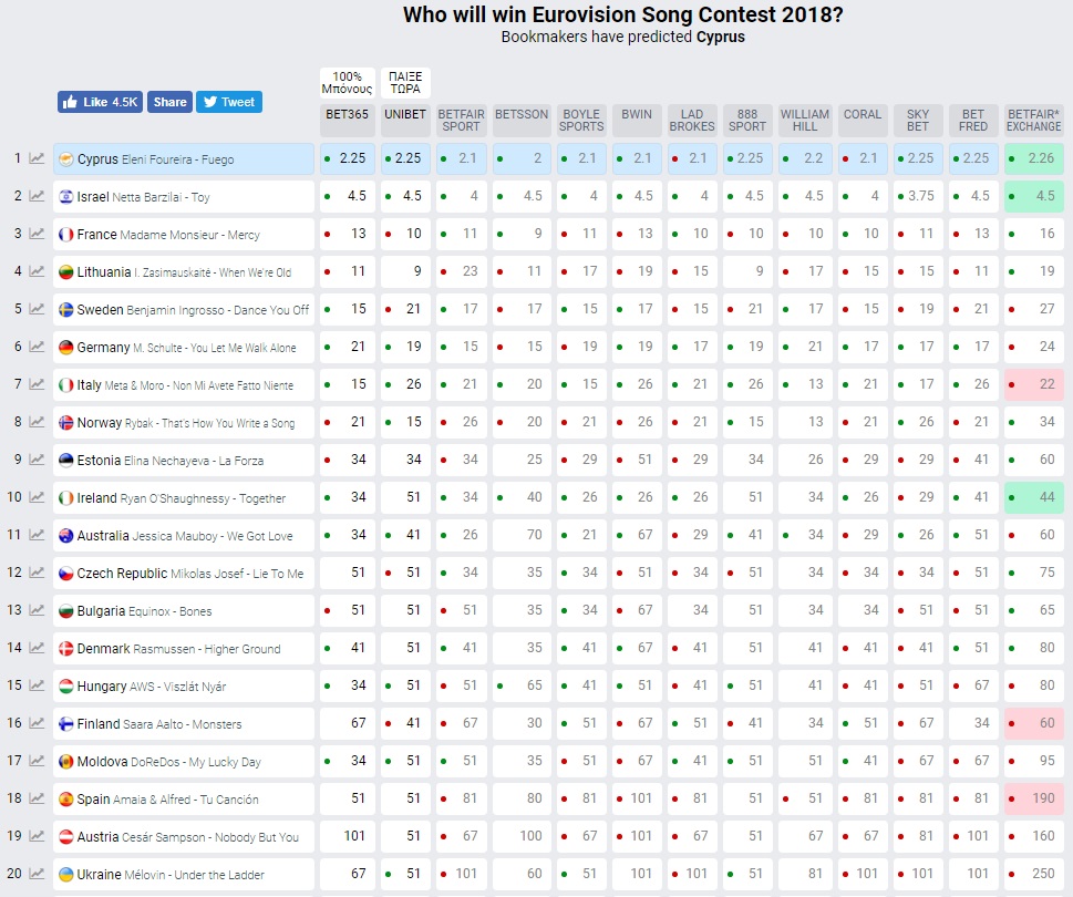 Μετά την ολοκλήρωση και του Β΄Ημιτελικού πολλά άλλαξαν στους στοιχηματικούς πίνακες. Ένα, όμως, έμεινε ίδιο: η Κύπρος παραμένει πρώτη και με διαφορά από το δεύτερο Ισραήλ. Από εκεί και κάτω βλέπουμε τη Γαλλία, τη Λιθουανία και τη Σουηδία να συμπληρώνουν την πρώτη πεντάδα. Την ίδια στιγμή, βλέπουμε κάποιες χώρες που ήταν μέχρι χθες φαβορί, όπως η Νορβηγία, η Εσθονία και η Βουλγαρία να έχουν πέσει αρκετές θέσεις χαμηλότερα.