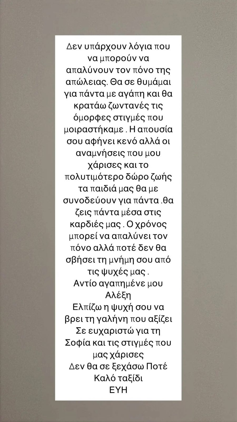 «Δεν υπάρχουν λόγια που να μπορούν να απαλύνουν τον πόνο της απώλειας. Θα σε θυμάμαι για πάντα με αγάπη και θα κρατάω ζωντανές τις όμορφες στιγμές που μοιραστήκαμε. Η απουσία σου αφήνει κενό αλλά οι αναμνήσεις που μου χάρισες και το πολυτιμότερο δώρο της ζωής, τα παιδιά μας θα με συνοδεύουν για πάντα.
