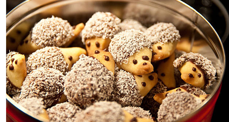 Πάρτε περίπου μια κουταλιά της σούπας από το μίγμα και με τα χέρια σας διαμορφώστε το σε μπάλα. Τσιμπήστε τη ζύμη σε μια μεριά για να σχηματίσετε τη μουσούδα του σκαντζόχοιρου. Επαναλάβετε μέχρι να τελειώσει και η ζύμη και τοποθετήστε τα μπισκότα σε ένα βουτυρωμένο ταψί (ή λαδόκολλα), λίγο αραιά μεταξύ τους.